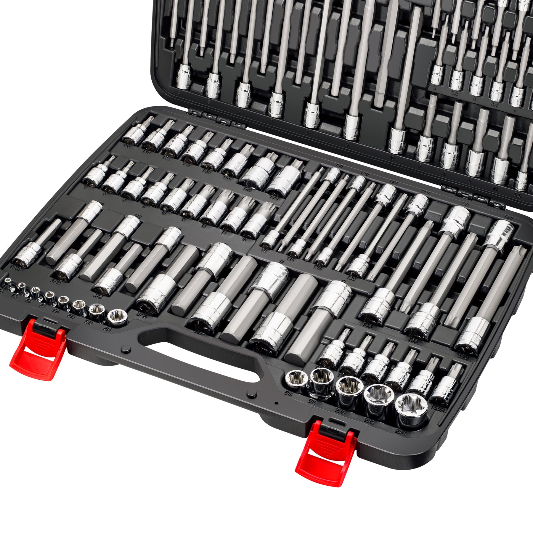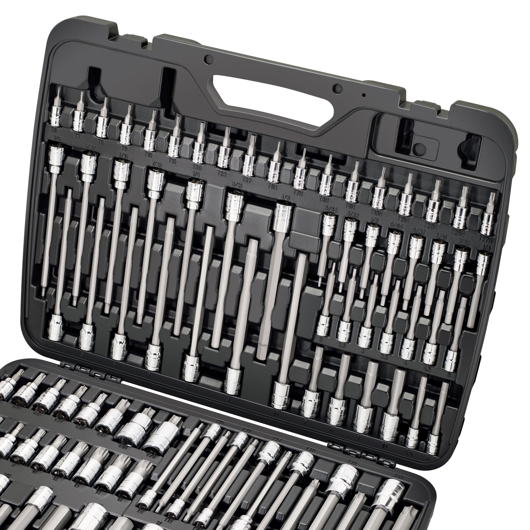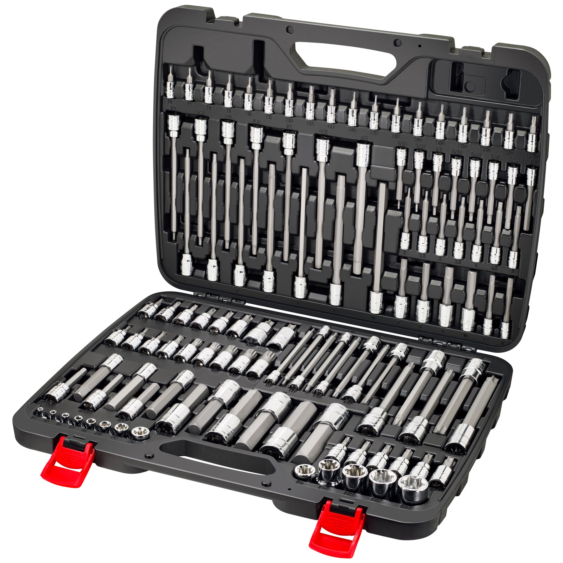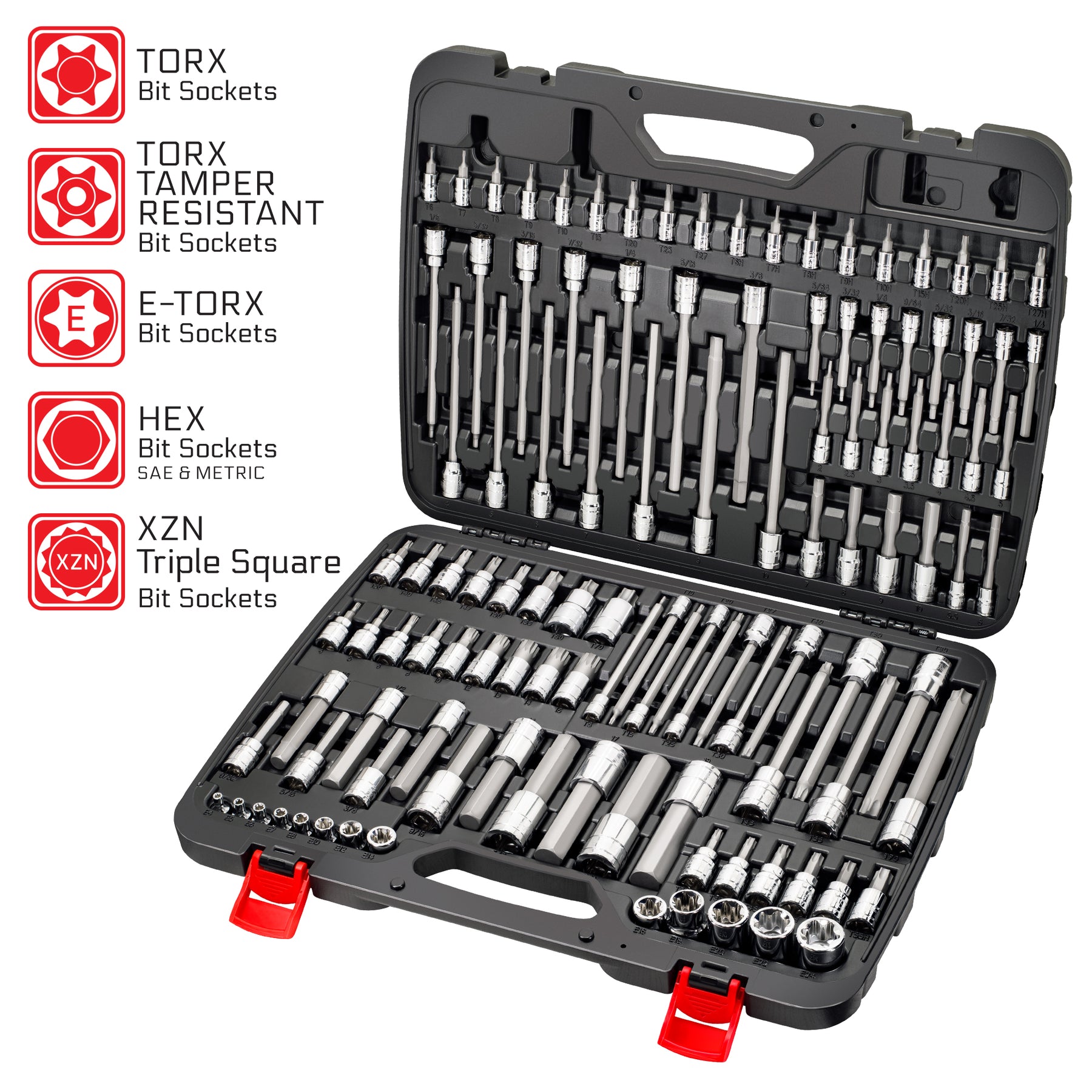Includes Torx T6-T70, Extra Long Torx T8-T70, Tamper Resistant Torx T6H-T55H, Mid-Length Metric Hex 2-19mm, Mid-Length SAE Hex 5/64"-3/4", Extra Long Metric Hex 4-10mm, Extra Long SAE Hex 1/8"-3/8", Extra Long XZN Triple Square 4-16mm, E-Torx Sockets E4-E24. See Listing Images for Detailed Contents.