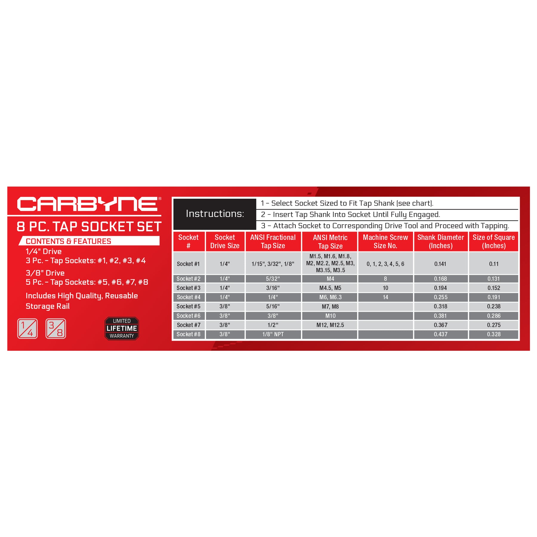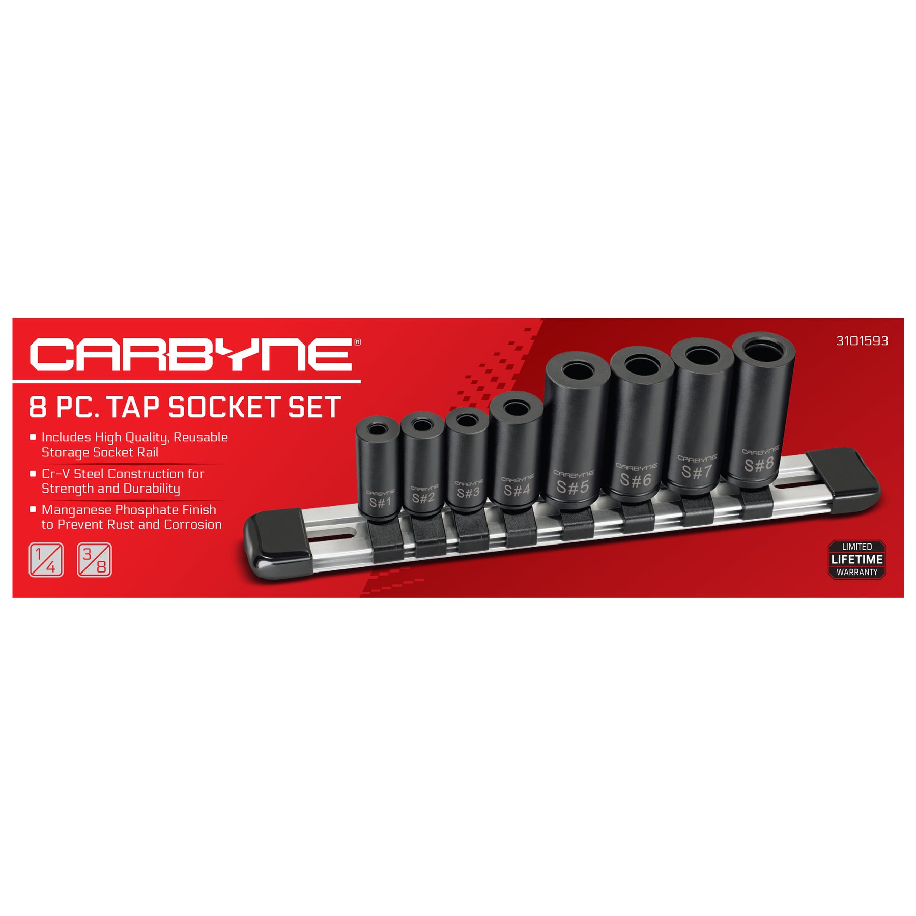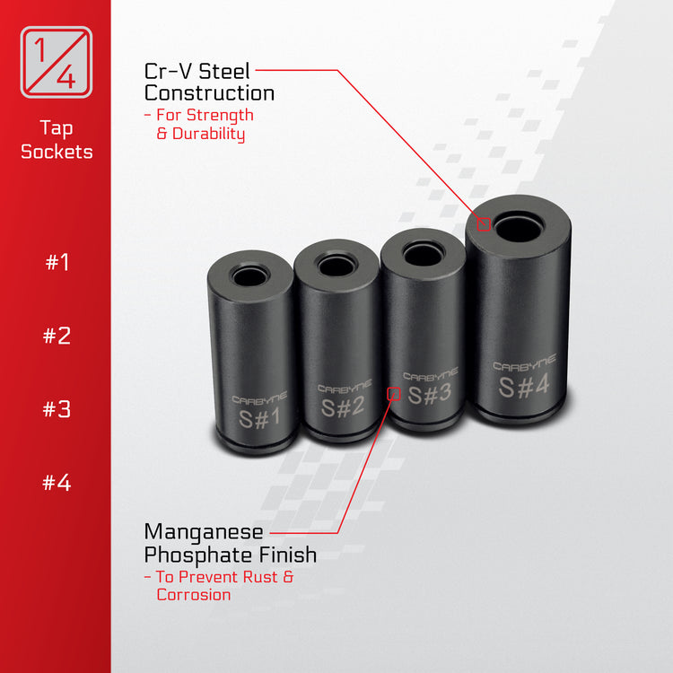 8-PIECE SET WITH STORAGE RAIL: Includes #1–#8 tap sockets (1/4" drive #1–#4, 3/8" drive #5–#8) plus a reusable socket rail for fast identification and organized storage. Backed by Carbyne’s Lifetime Warranty for your complete peace of mind.