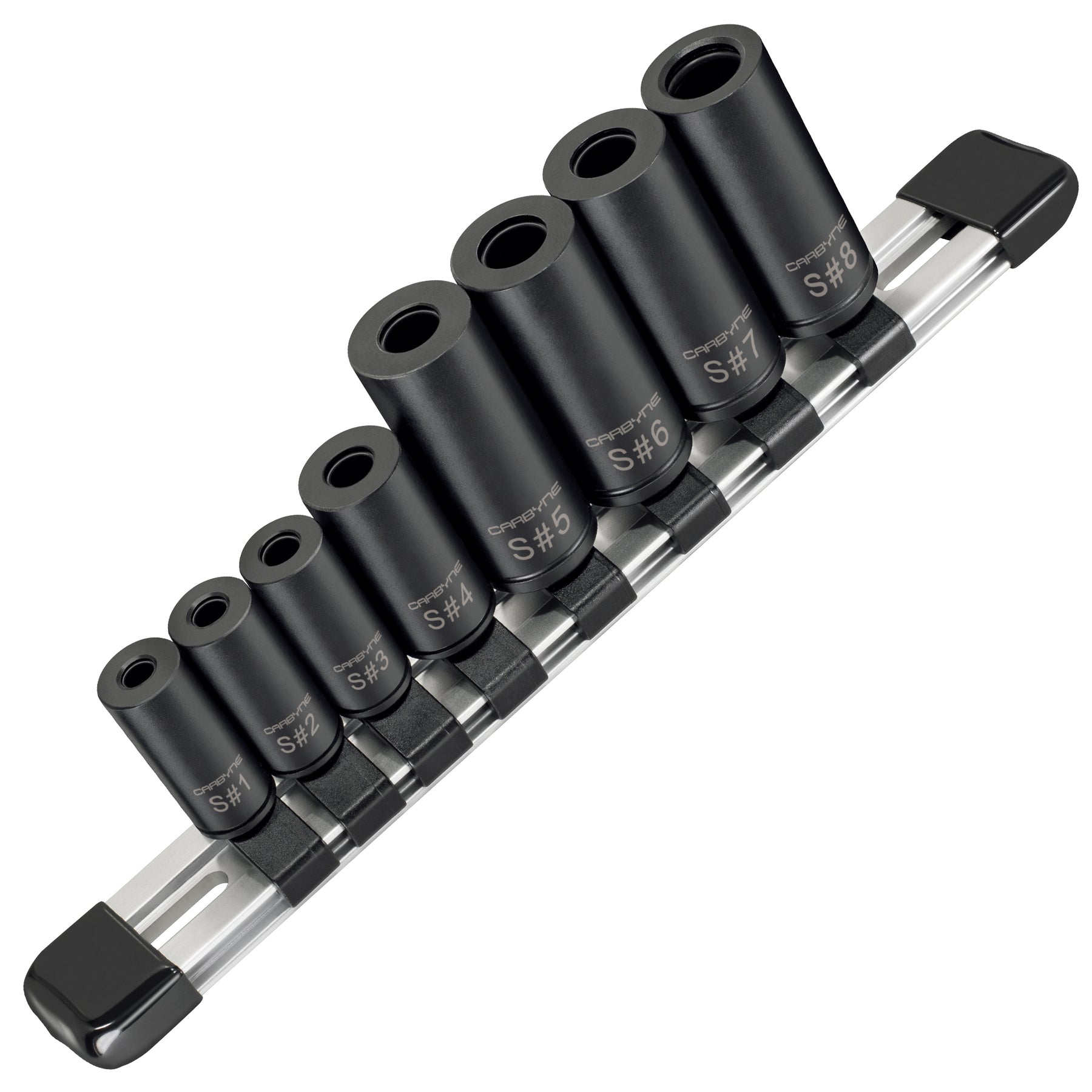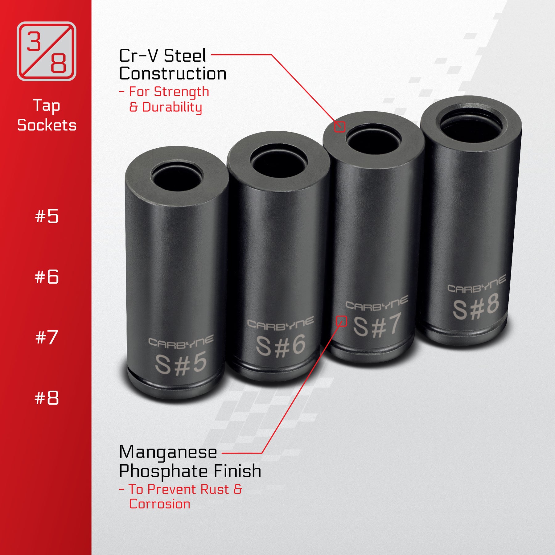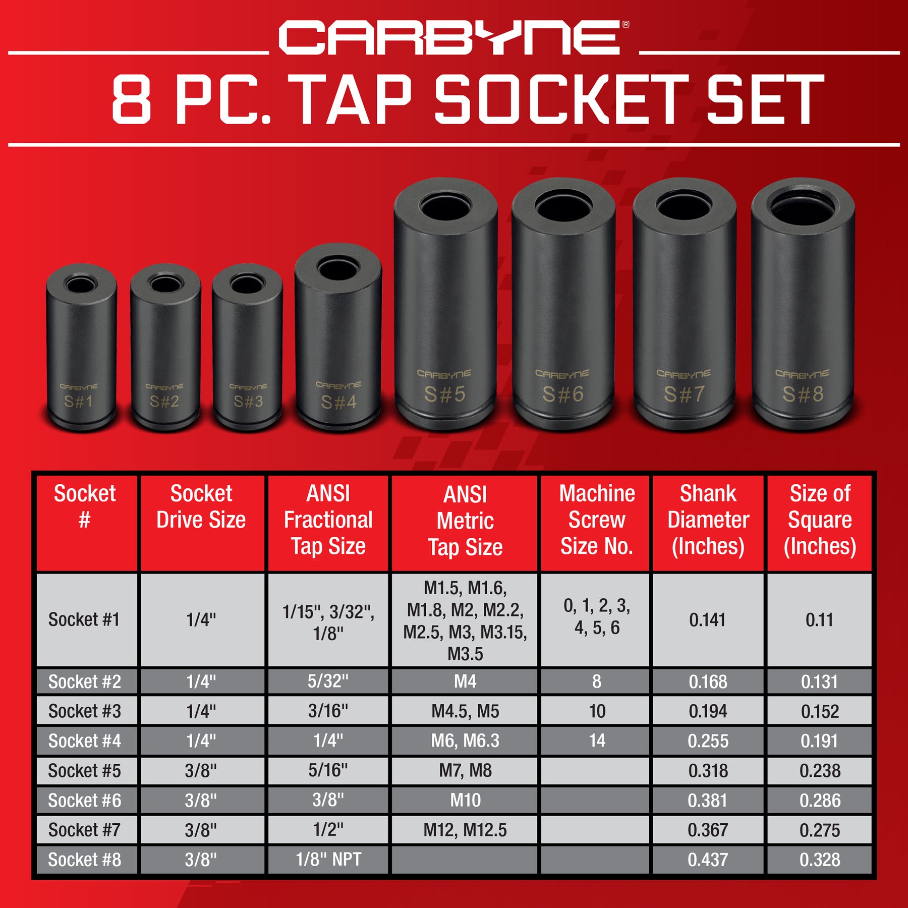 8-PIECE SET WITH STORAGE RAIL: Includes #1–#8 tap sockets (1/4" drive #1–#4, 3/8" drive #5–#8) plus a reusable socket rail for fast identification and organized storage. Backed by Carbyne’s Lifetime Warranty for your complete peace of mind.