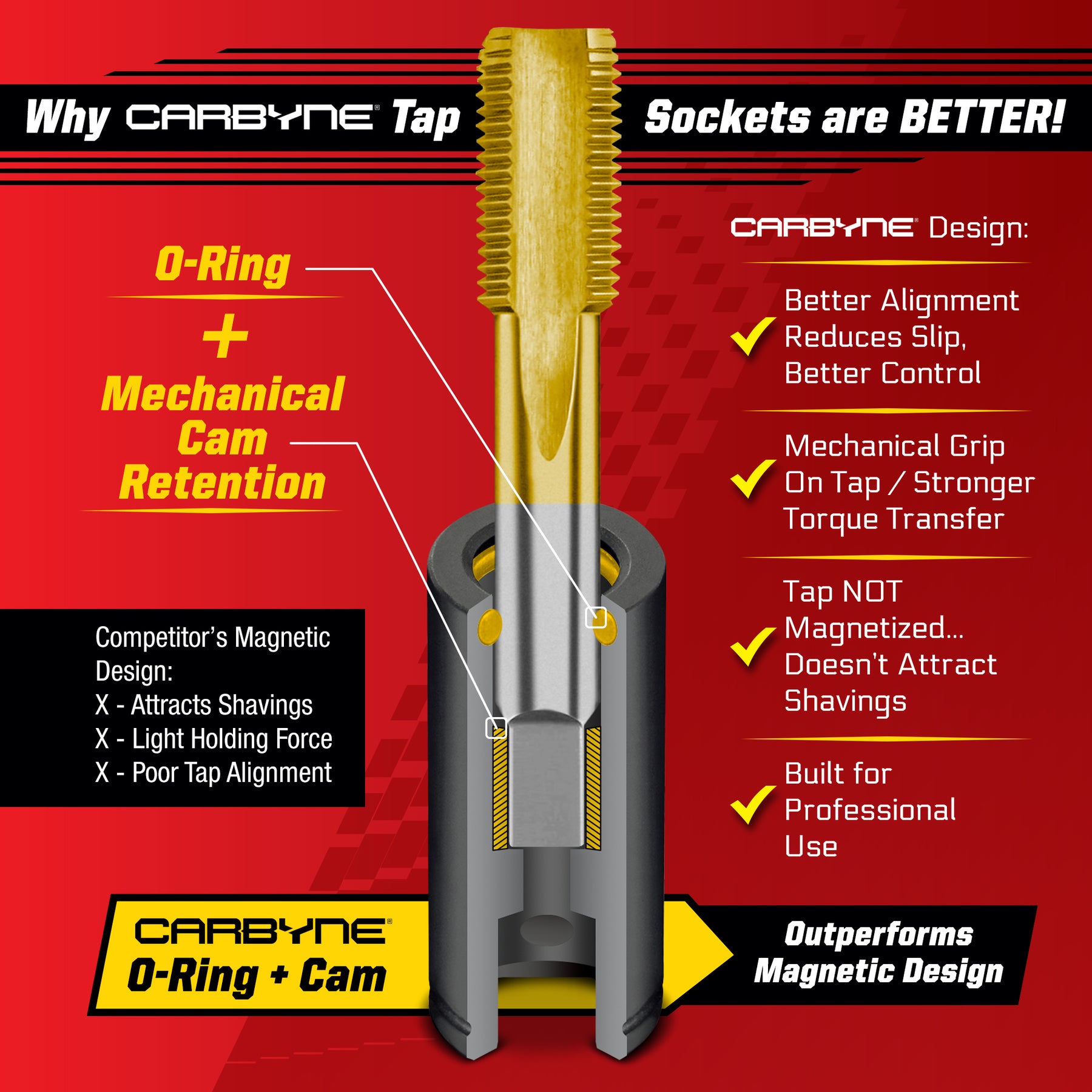 CAM + O-RING RETENTION (STRONGER THAN MAGNETIC): Mechanical cam retention grips the tap square securely for better torque transfer and reduced slip—outperforms magnetic tap sockets under load.
